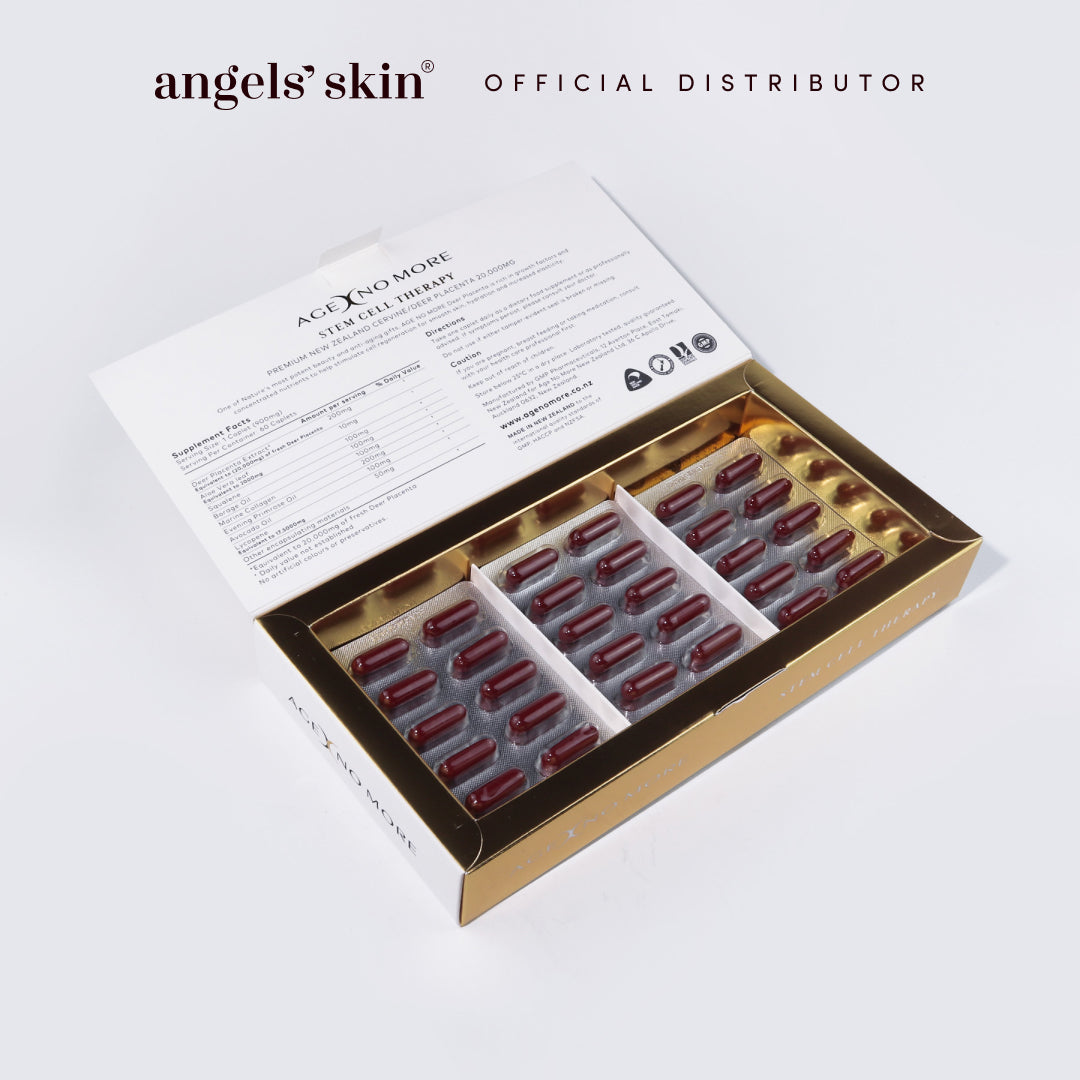 AGE NO MORE Cervine Stem Cell Therapy Caplets contain eight active ingredients – with double the amount of active deer placenta stem cells than that of other deer placenta products – to really nourish the skin and ensure you get that youthful glow.